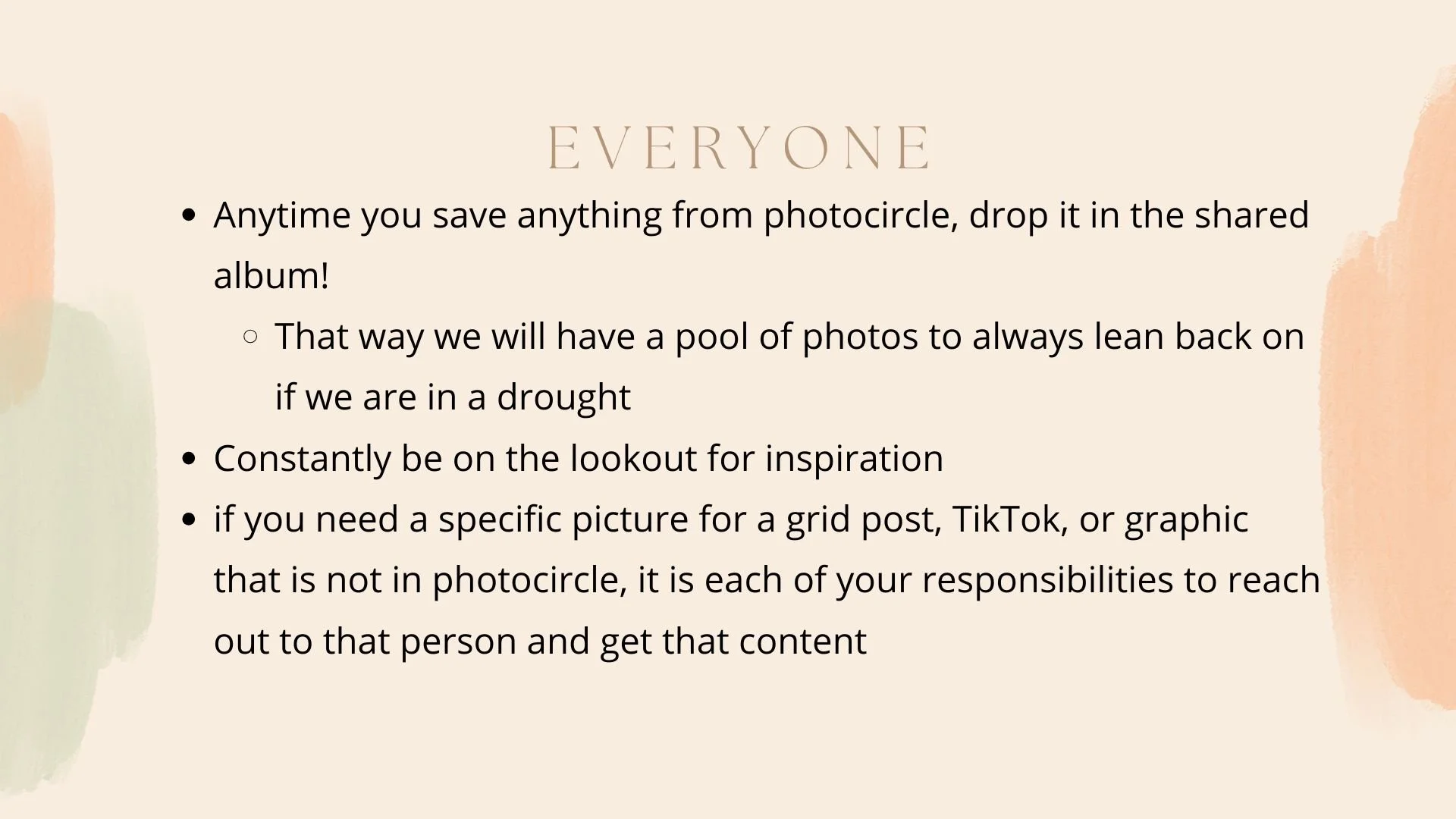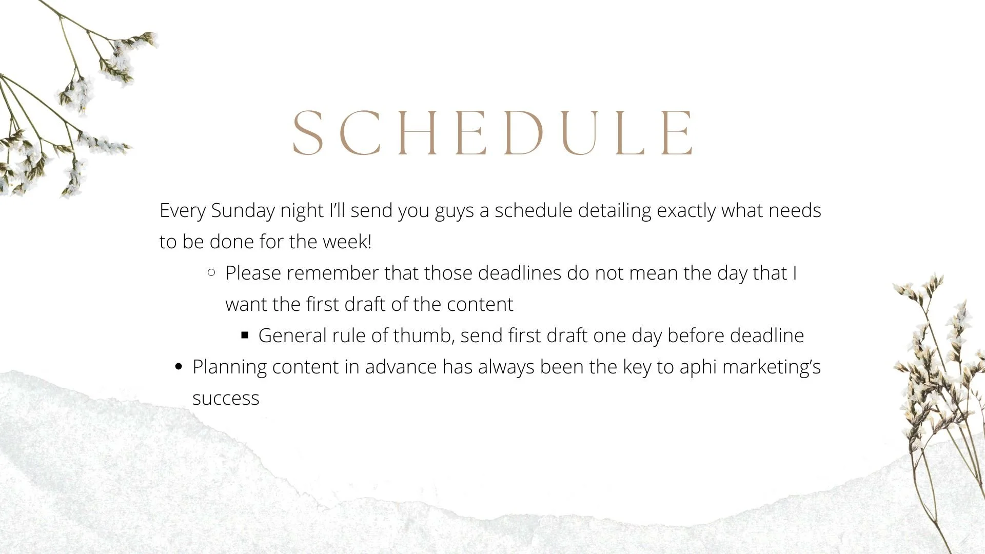 Communication within my team was of the utmost importance to me as VP of Marketing. When I worked under the previous VP, I felt that deadlines were rushed and assigned without an appropriate amount of time to produce quality work. Below is the slideshow I designed for my first marketing meeting as VP, where I introduced the addition of a schedule to be sent out at the beginning of the week with deadlines and expectations.