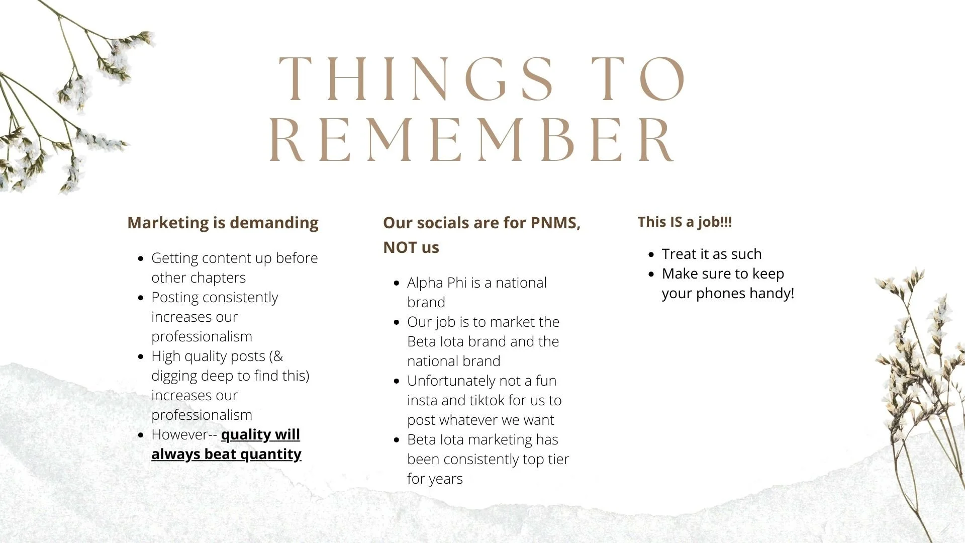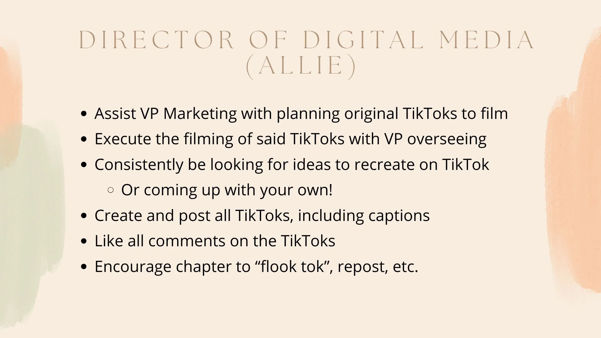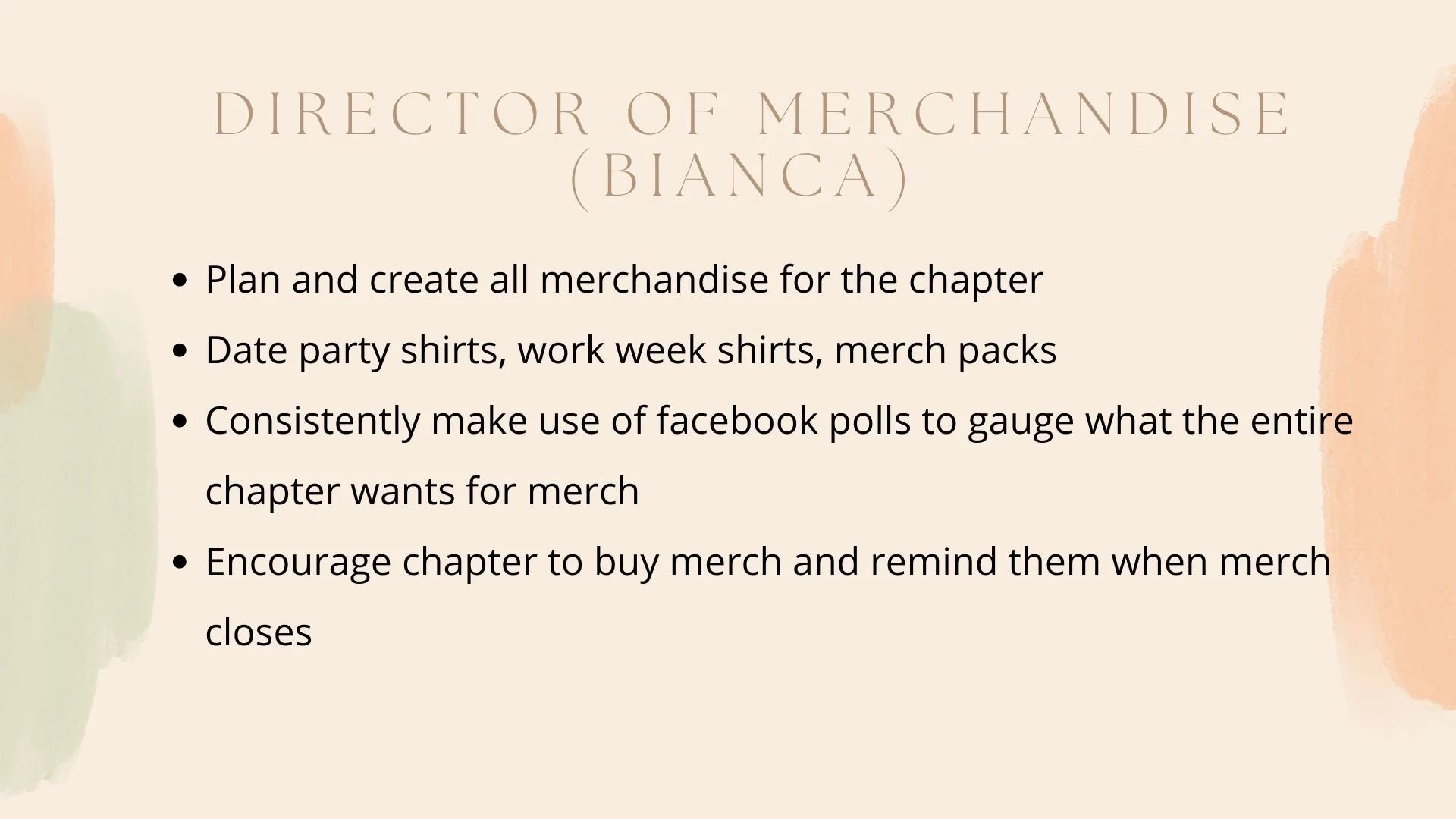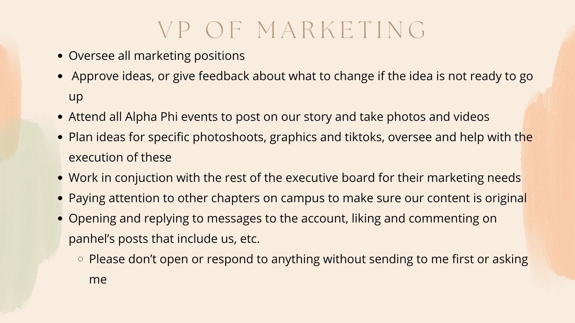 When I was a new member of Alpha Phi, I noticed that many of us did not fully understand the roles of each executive position or what was expected of us in relation to them. Because of this, it was often unclear how we could best support their work or contribute to the chapter in meaningful ways. As Vice President of Marketing, I introduced an initiative where each executive member attends a new member meeting to introduce themselves and explain their responsibilities. The following presentation was designed to clearly communicate my role in a way that is simple, engaging, and easy for new members to understand.